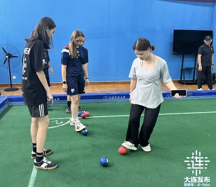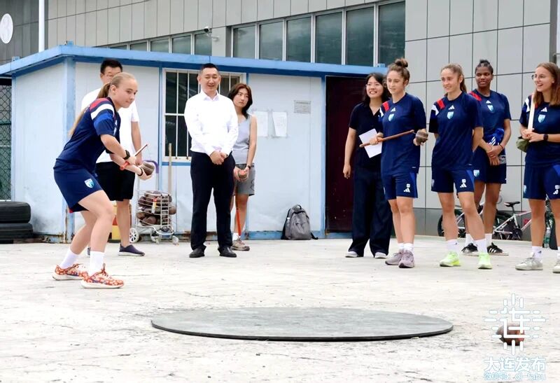 當(dāng)日下午,上法蘭西綜合理工大學(xué)女子足球隊的二十多名隊員和教練員,來到大連民族大學(xué)開發(fā)區(qū)校區(qū),與大連民族大學(xué)師生就中國傳統(tǒng)民族體育運動蹴球和陀螺,展開了一場生動有趣的交流和對抗。