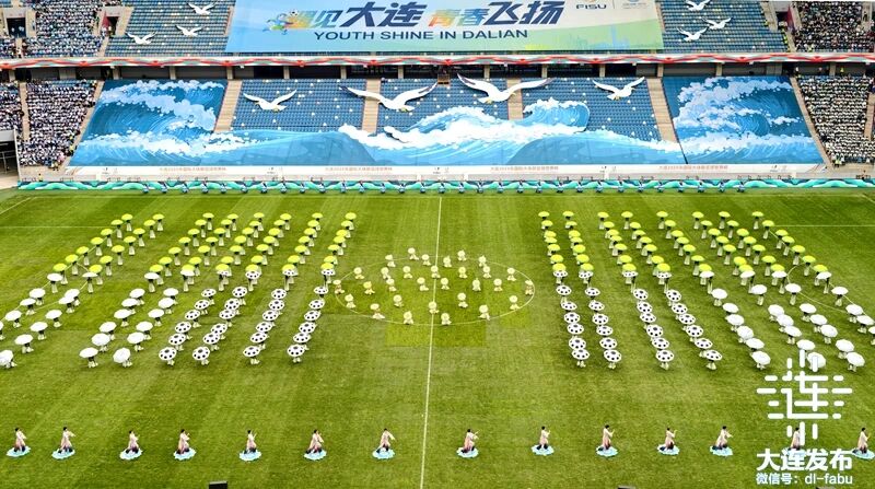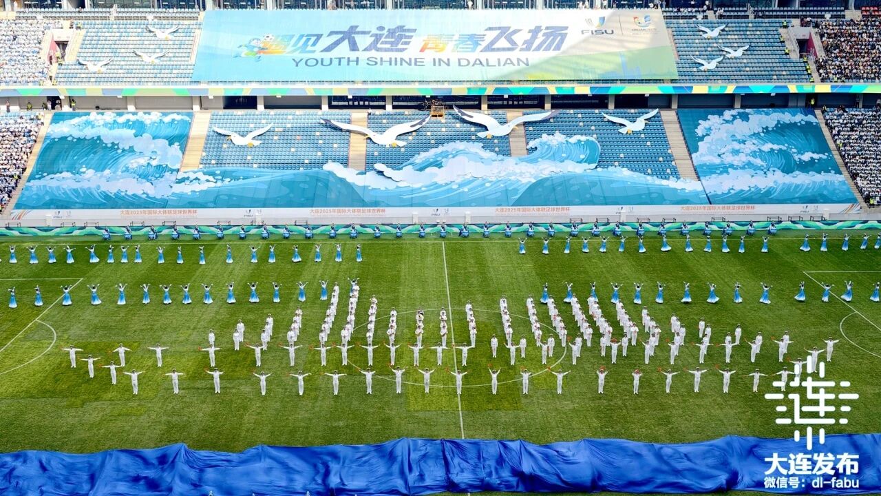 承擔(dān)開場儀式表演的,除了來自大連7所高校的1200多名大學(xué)生外,大連市童聲合唱團(tuán)的孩子們手持大賽吉祥物奔跑入場,盡顯大連兒童的蓬勃朝氣;在《茉莉花》的表演中,來自大連歌舞劇院的演員們,以曼妙的舞姿詮釋中國傳統(tǒng)文化的獨(dú)特魅力;大連雜技團(tuán)在主題曲《我們要?jiǎng)倮分腥谌肭啻貉笠绲奈璧福袒盍λ纳?,將現(xiàn)場氛圍推向高潮。