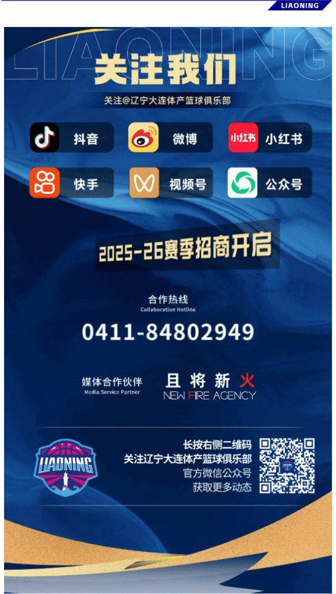 遼寧大連體產(chǎn)籃球俱樂部”抖音官方賬號將全程直播。您的互動與支持將成為選手人氣評選的重要依據(jù)。抖音掃碼關(guān)注我們,