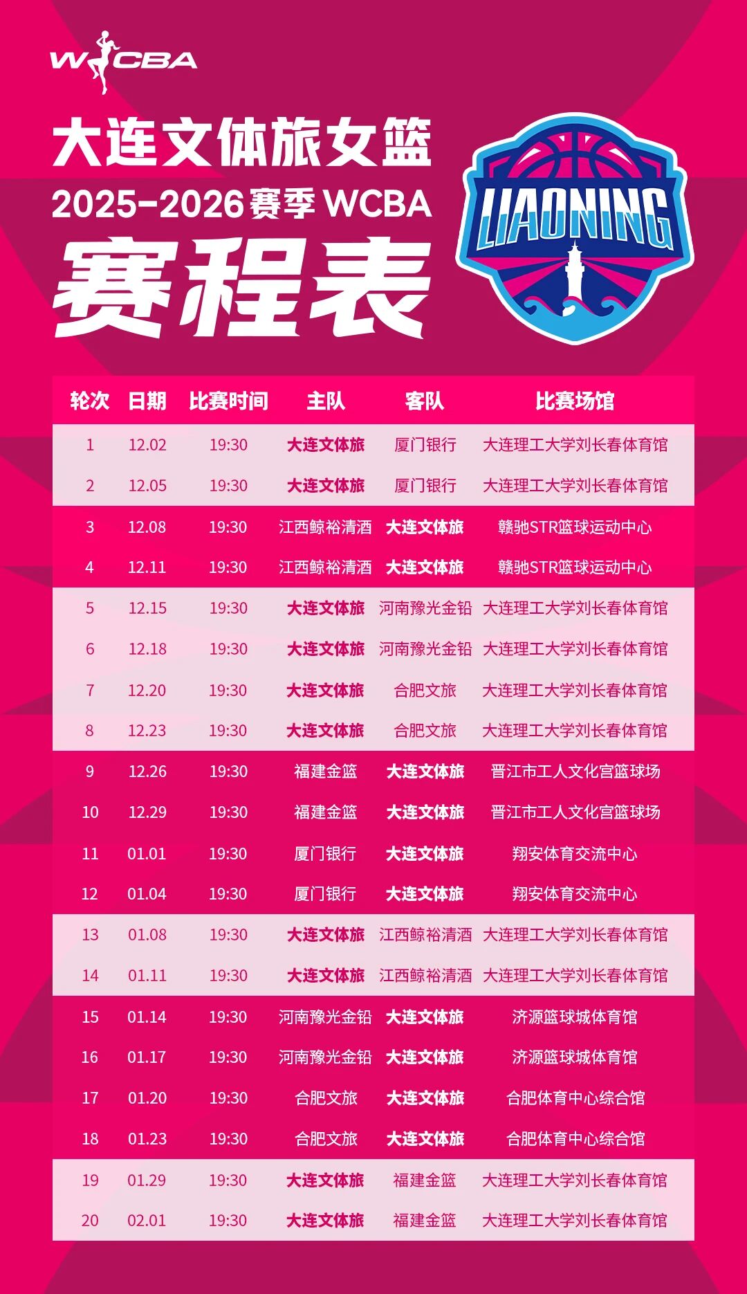 2025-2026賽季中國(guó)女子籃球聯(lián)賽(WCBA)官方賽程表已公布,大連文體旅女籃新賽季首場(chǎng)比賽將于2025年12月2日拉開(kāi)帷幕,揭幕戰(zhàn)大連文體旅女籃坐鎮(zhèn)主場(chǎng)——大連理工大學(xué)劉長(zhǎng)春體育館,迎戰(zhàn)廈門(mén)銀行。詳細(xì)賽程表見(jiàn)下圖,歡迎廣大球迷朋友們收藏。