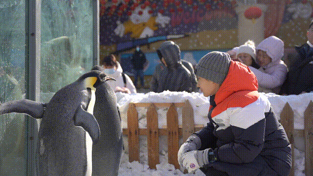 節(jié)日期間,憨態(tài)可掬的北極熊“團子”、“圓子”與南極帝企鵝們早早就出門迎客,與游客一起慶祝佳節(jié)。