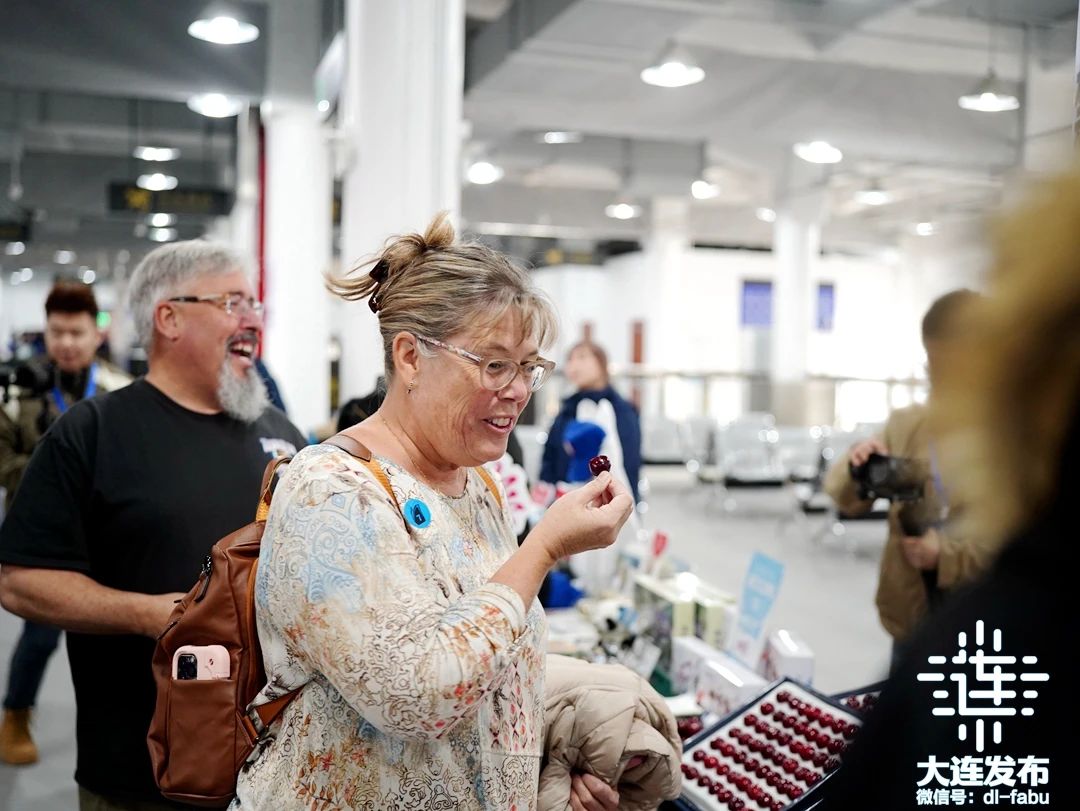 現(xiàn)場(chǎng),身著傳統(tǒng)服飾的民樂團(tuán)現(xiàn)場(chǎng)演奏《茉莉花》等名曲縈繞回響、聲聲入耳;整齊置放在迎客大廳售賣專區(qū)代表大連地工特色和文創(chuàng)特點(diǎn)的“大連禮物·大連名品”商品琳瑯滿目、特色鮮明;普蘭店區(qū)四平街道帶來的新鮮大櫻桃深受喜愛,游客們現(xiàn)場(chǎng)試吃、贊不絕口。