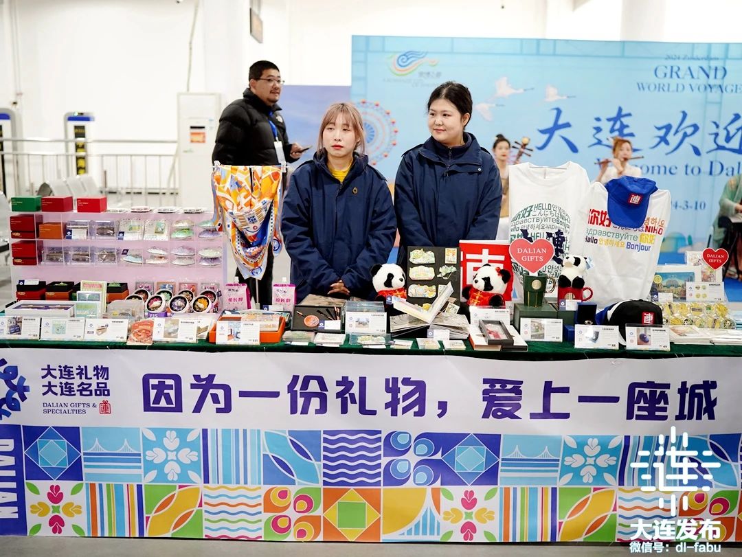 在“大連禮物·大連名品”售賣專區(qū),大連地標(biāo)建筑的冰箱貼、大連貝雕、印有大連字樣的T恤、明信片、立體書等大連特色的文創(chuàng)商品整齊擺放,讓許多外國(guó)游客愛不釋手。