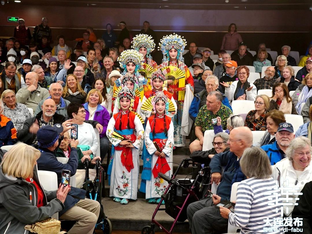 為了讓游客們沉浸式體驗(yàn)中華優(yōu)秀傳統(tǒng)文化,大連城市音樂館特別準(zhǔn)備了一場(chǎng)約30分鐘的演出。民樂合奏《象王行》《財(cái)神到》將中國(guó)民族樂器的魅力展現(xiàn)得淋漓盡致;中國(guó)舞《豆蔻梢頭》古典曼妙,贏得滿堂彩;由孩子們表演的聲樂合唱《福氣要來到》朝氣蓬勃;京劇表演《賣水》《梨花頌》粉墨登場(chǎng),讓游客們震撼不已。演出結(jié)束后,游客們爭(zhēng)相與演員合影,將這快樂的記憶定格、封存。