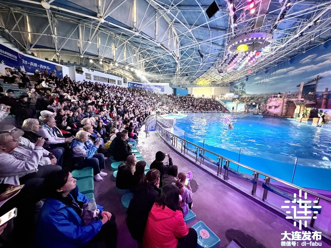 3月10日,大連老虎灘海洋公園內(nèi)熱鬧非凡,靈動(dòng)的白鯨、唯美的魚群悠閑游弋,引得外籍游客們紛紛駐足觀賞。海洋表演拉開序幕,伴隨著熱烈的音樂,游客們與演員開心互動(dòng),跟著音樂搖擺起來。隨著輕快的開場(chǎng)音樂響起,海豚躍出水面,激起一片水花,贏得了游客們的陣陣掌聲,這一刻的海洋公園成為了歡樂的海洋。