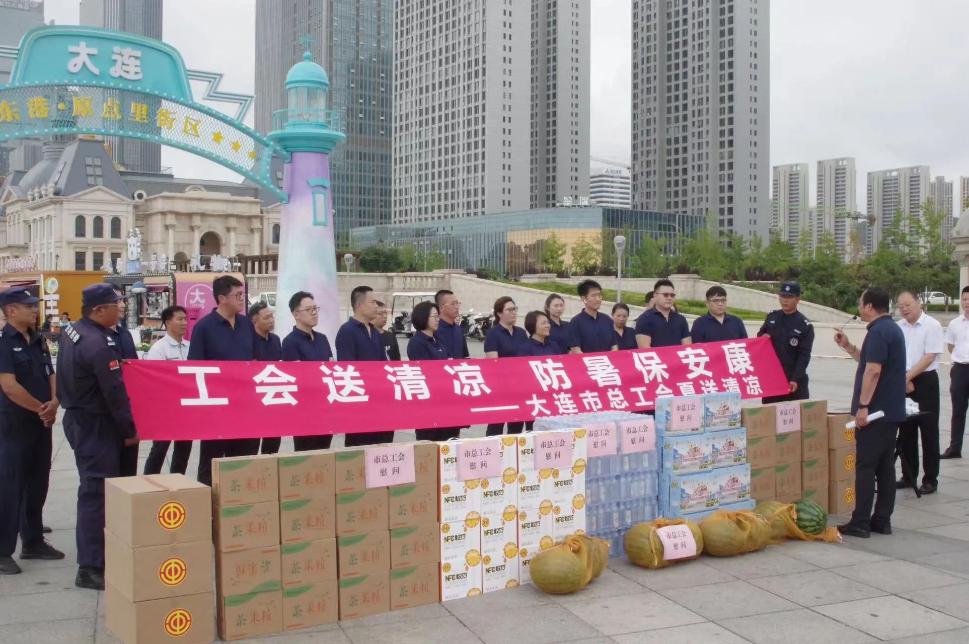 在炎炎夏日,高溫持續(xù)“烤”驗(yàn)著堅(jiān)守在一線崗位的職工們。近日,市總工會(huì)領(lǐng)導(dǎo)帶著對(duì)一線職工的親切關(guān)懷,深入大連文旅集團(tuán)東港公司開(kāi)展送清涼慰問(wèn)活動(dòng)。市紀(jì)委監(jiān)委派駐市委統(tǒng)戰(zhàn)部紀(jì)檢組組長(zhǎng)劉承慶、市總經(jīng)濟(jì)技術(shù)和勞動(dòng)保護(hù)部部長(zhǎng)曹福韜、市財(cái)貿(mào)金融服務(wù)工會(huì)主席梁天翼一行,為在酷暑中堅(jiān)守崗位的職工們送上了西瓜、蜂蜜和飲料等防暑降溫食品。大連文旅集團(tuán)黨委副書(shū)記、工會(huì)主席崔波等陪同慰問(wèn)。